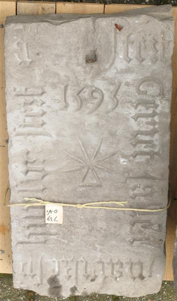 Een hardstenen grafzerk, met in het midden een maltezerkruis en een opschrift.