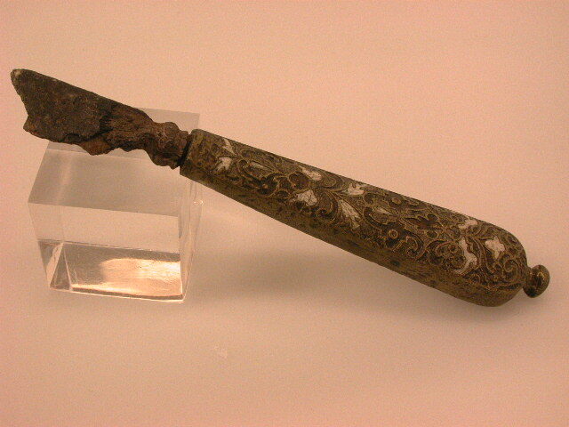 - BeschrijvingKoperen mesheft met versiering van ornamentaal bladwerk in email champlevé-techniek. Aan het heft bevindt zich nog een klein stukje van het oorspronkelijke ijzeren lemmet.