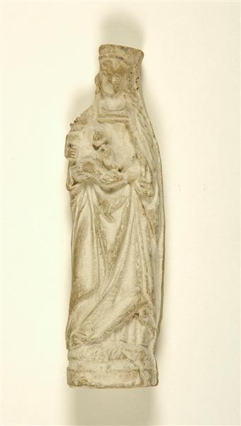 Pijpaarden beeldje, enigszins geschonden, van O.L.Vrouw met kind uit Mad
