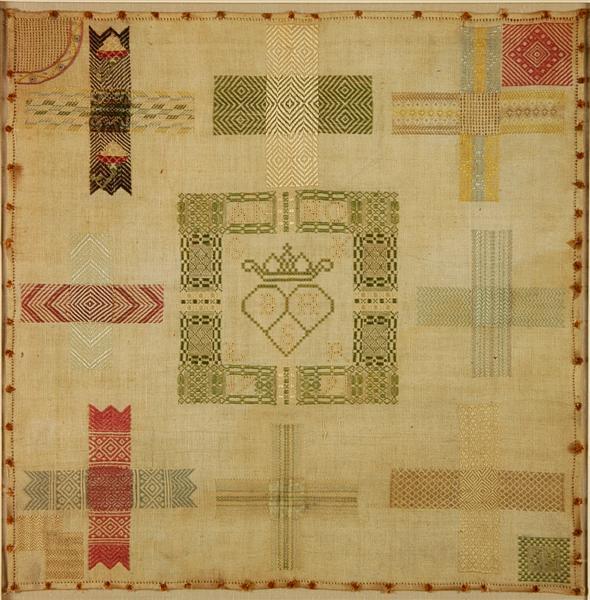 Stoplap van witte katoen, borduurwerk in verschillende kleuren zijde. Voorkomende technieken: stersteek, kettingsteel, open naaiwerk, doorstop en stopwerk in diverse patronen. In het midden en gekroond hart waarin "B" "H" en "S" en eromheen G,K,L,en R. Daaromheen een "raam" van doorstopwerk. In bovenrand raam "ANNO" in onderrand "1791" Om het raam diverse stoppen. De 4 hoeken verschillend bewerkt. In een hoek "69" in doorstoptechniek. De lap is langs de randen afgewerkt met een open zoompje. De doek was ingelijst.