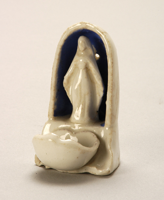 - BeschrijvingWit porseleinen staand wijwaterbakje. Op een holle voet een nis met daarin een Mariabeeldje. Aan de voorzijde, tegen de voet, een schelpje. Het geheel is wit geglazuurd. De nis is aan de binnenzijde blauw (geglazuurd, geverfd?), de ceintuur is goudkleurig. Boven in de nis 3 gaatjes. De nis was mogelijk bekroond met een kruisje. Gelijk aan 08923.