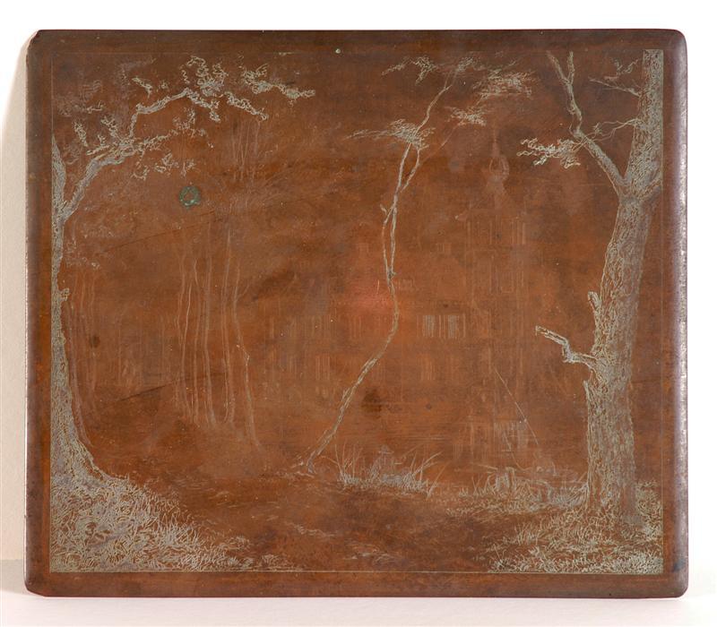 Koperen etsplaat met rechtsvoor naar linker middenplan lopend pad bomen langs slotvijver. Langs de kant twee vissers, een in roeiboot, een op de wal. Aan het eind van het pad een vrouw met een mand onder een halfgeopende poort, in het fronton in spiegelbeeld BOUVIGNE. Centraal in de slotgracht rechthoekig kasteel rechts achthoekige toren met ui-vormige spits links toegangsbrug.