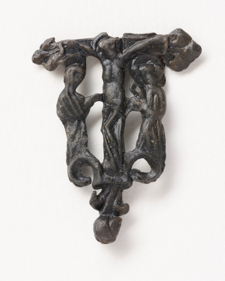 - BeschrijvingInsigne in de vorm van een Maria en Johannes onder het Kruis op het kruis een Christusfiguur. Onder het kruis een versiering. Ter bevestiging bevindt zich zowel onder de Maria- als onder de Johannesfiguur een gaatje het ophangoogje aan de bovenzijde van het kruis ontbreekt.