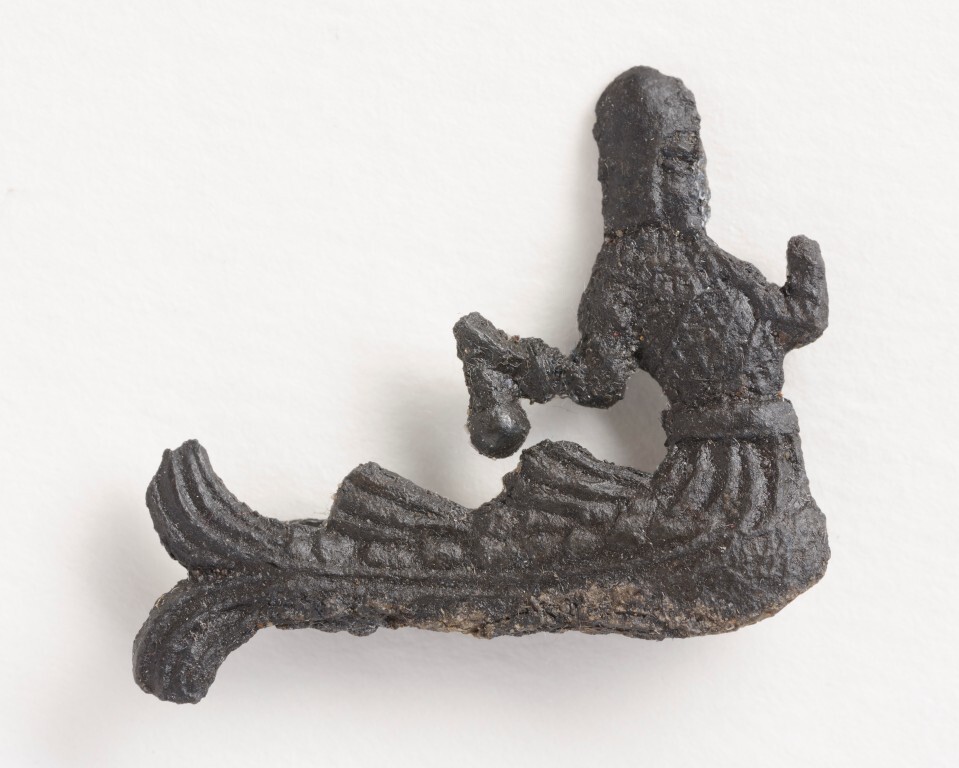 - BeschrijvingInsigne in de vorm van een geharnaste zeemeerman met helm en zwaard (zwaard ontbreekt grotendeels). Aan de achterzijde bevindt zich nog de draagspeld. Het onderhavige exemplaar vertoont grote gelijkenis met het type: Van Beuningen en Koldeweij (1993), afb. 601, maar wijkt toch iets daarvan af.
