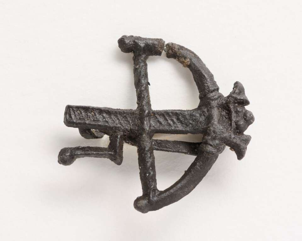 - BeschrijvingInsigne in de vorm van een gekroonde kruisboog met rechts een windas. Draagspeld aan achterzijde nog aanwezig. Vgl. Van Beuningen en Koldeweij (1993), afb. 960