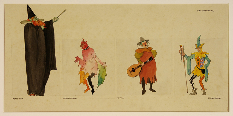 - BeschrijvingDe gelaarsde Kater III: 1. De tovenaar; 2. De dienende duivel; 3. De narren; 4. Idem. De taferelen zijn in vier afzonderlijke rechthoeken geplaatst.