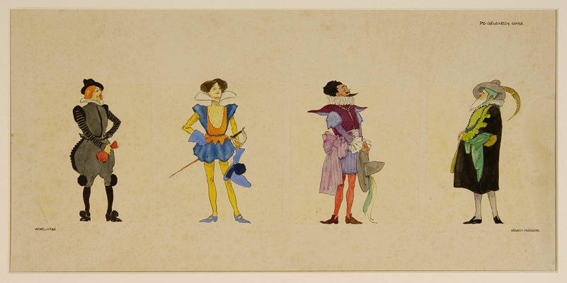 - BeschrijvingDe gelaarsde Kater VI: 1. de hovelingen II; 2. idem; 3. idem; 4. idem De ontwerpen zijn in vier afzonderlijke rechthoeken geplaatst.