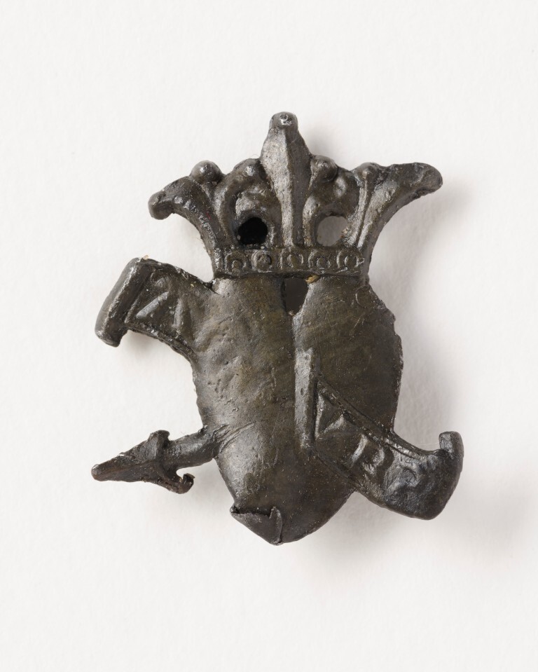 - TitelInsigne in de vorm van een gekroond hart met pijl en tekstbanderol