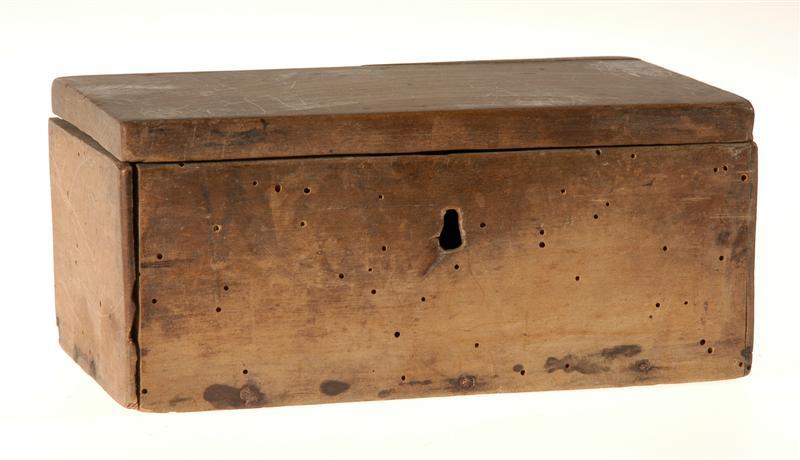 - BeschrijvingEikenhouten doosje met scharnierend deksel met slot. Bevat aantal koperen rietjes.