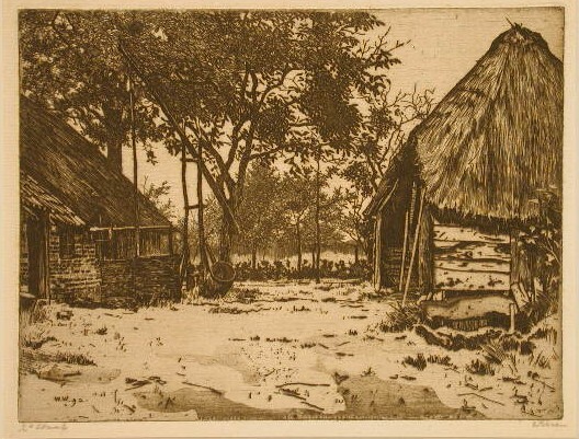- BeschrijvingLinks een gedeelte van een boerderij met een rieten dak. Daarvoor een put met puthaak. Achter de boerderij staan hoge bomen. Rechts een schuur eveneens met een rieten dak.