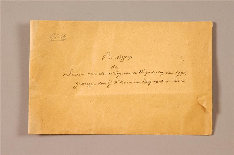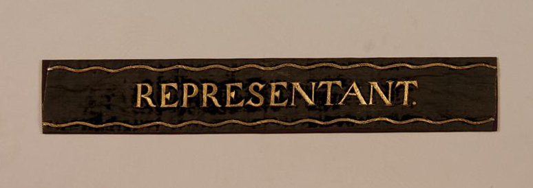 - BeschrijvingFragment van een band met zwarte zijden fluweel, geborduurd met gouddraad. Langs de lange kanten een golvende rand, daartussen in kapitalen "REPRESENTANT". Gevoerd met wit linnen. De borstsjerp werd gedragen door leden van de Wetgevende Vergadering van 1786-1798. Los briefje bij de borstsjerp.