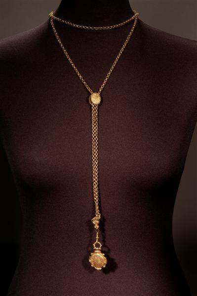 - BeschrijvingGouden schuifketting met een medaillon, waarin portret (van een heilige?) en haar (gevlochten). Rond medaillon en ovale schuif hol gestampt en gegraveerd.