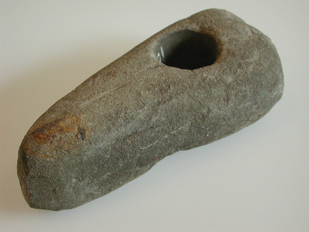 Grijze hamer. Ruw, spitse top, met steelgat.