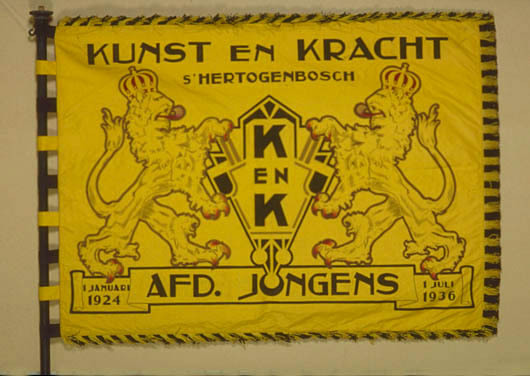 Van de Vereniging "Kunst en Kracht", 's-Hertogenbosch, afd. Jongens. Beschilderd geel zijden vaandel. Langs bovenzijde in zwart "KUNST EN KRACHT". Daaronder "S'HERTOGENBOSCH". In het midden twee klimmende leeuwen, een zwart fantasiewapen houdend. Op het wapen het opschrift K en K. Langs onderzijde op banderol "1 JANUARI 1924" AFD.JONGENS 1 JULI 1936". Keerzijde identiek. Langs boven-, vlucht- en onderzijde geel-zwarte rayon franje. Aan stokzijde 9 lussen afwisselend zwart en geel, 5 zwarte-4 gele. Zie voor draagbandelier inv.nr. 11434.2.