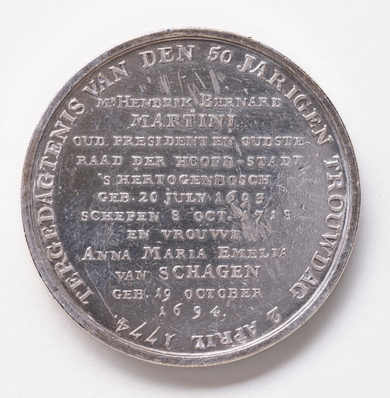 Omschrift: TER GEDAGTENIS VAN DEN 50 JARIGEN TROUWDAG 2 APRIL 1774