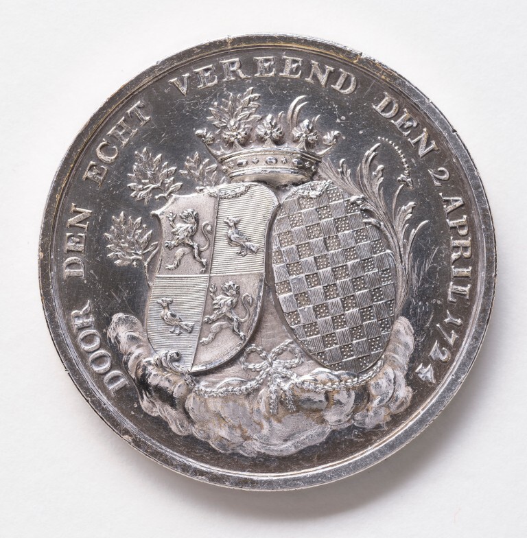 Vz:De gekroonde familiewapens Martini en Van Schagen; omschrift: DOOR DEN ECHT VEREEND DEN 2 APRIL 1724