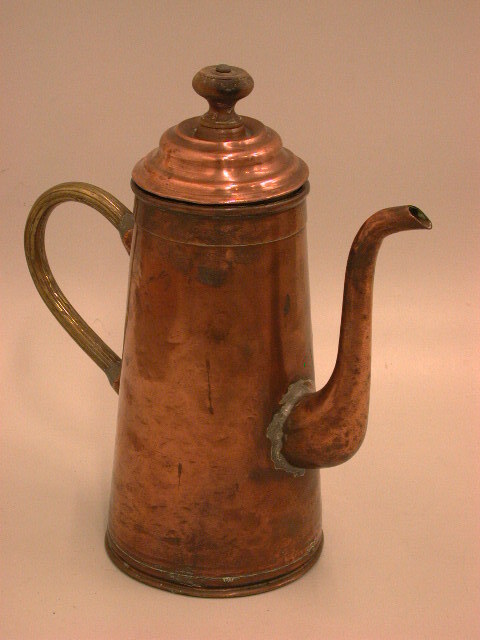 Roodkoperen, inwendig vertinde, koffiekan met cylindrisch, licht konisch lichaam en voetring uit een stuk. Geelkoperen, op 2.8 cm hoogte, hangende bodem. Lange, stijle, S-vormige roodkoperen tuit. Rond-geelkoperen gegroefd handvat in halve hart-vorm. Geprofileerde roodkoperen deksel met houten knop en geelkoperen binnenring.