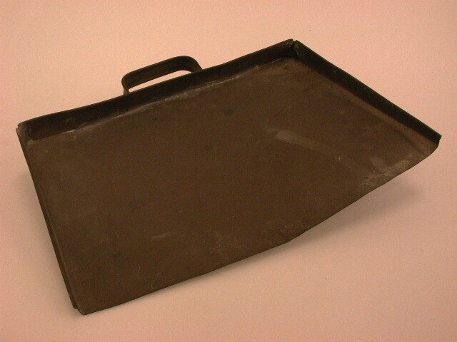 Geelkoperen rechthoekig stofblik met opstaande rand langs drie zijden en aangesoldeerd handvat aan de lange zijderand.
