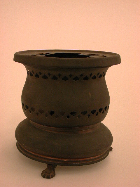 - BeschrijvingMet platte bodem op drie 1.5 cm hoge leeuwenvoetpootjes, 4 cm hoog bollend reservoir en 10 cm hoog vaasvormig "lichaam" (boven hol, onder bol) waarin twee banden met uitgesneden alternerende hart- en ruitvormen. Dekplaatje met accolade-achtige uitsnijdingen rond centrale opening.