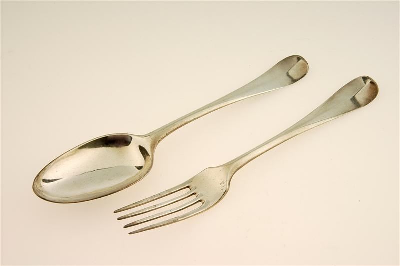 - BeschrijvingZilveren tafelcouvert. Achterzijde steeluiteinde gegraveerd met de letters "P V D". Lepel met Haags lof.
