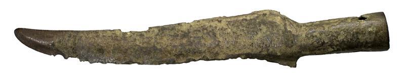 Bronzen mes, sierlijk van vorm, het handvat hol en van twee gaatjes voorzien.