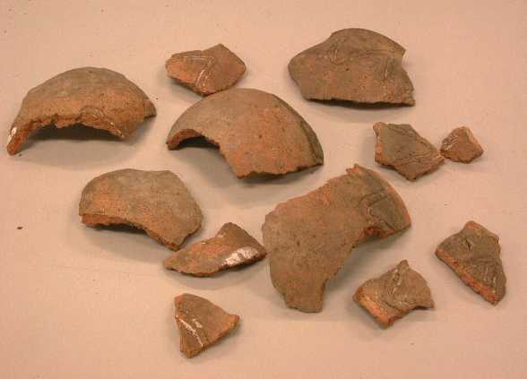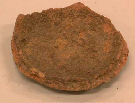 - BeschrijvingGaaf, rood-geel, ongelijk dubbelconisch potje, versierd met omlopende dubbele zigzag (golf) lijn op schouderstuk. De niet verdikte rand is enigszins naar buiten gebogen. Sporen van witte incrustatie.