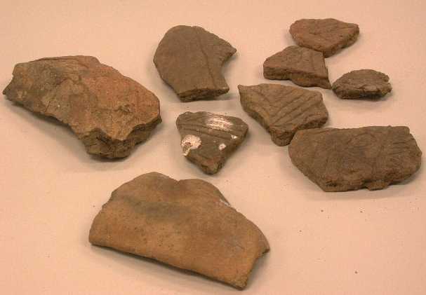 Acht scherven van waarschijnlijk Gallo-Germaans aardewerk, hoewel de versiering vreemd is.