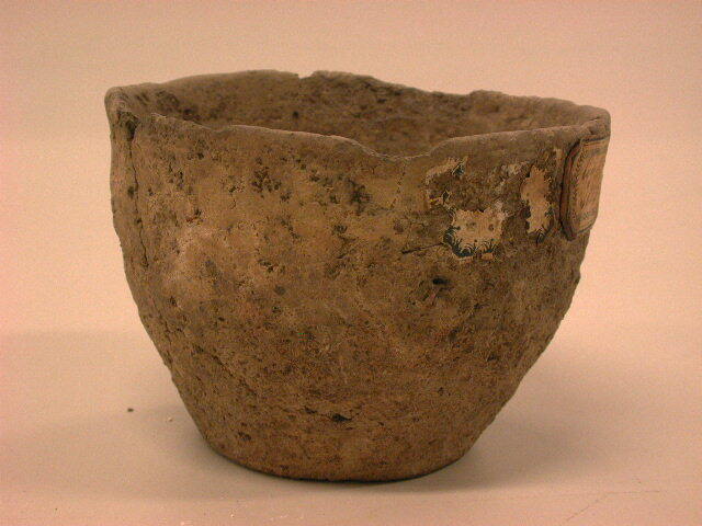Germaans bijpotje van wel-doorkneed leem met leemsop gladgestreken en goed gebakken. Korte staande naar binnen gebogen hals. Bekervorm.