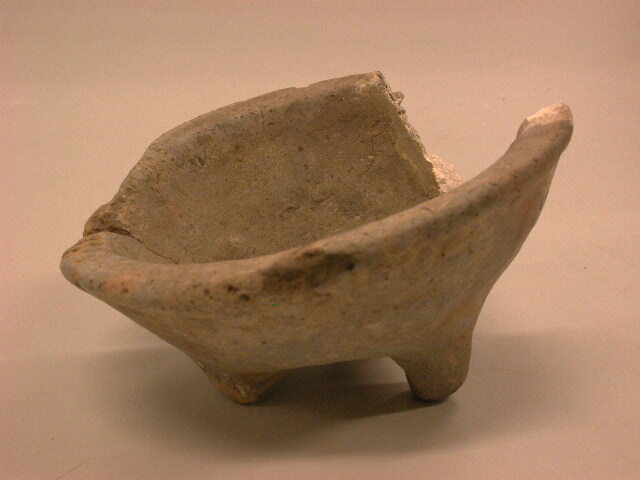 Germaans bijpotje van wel-doorkneed leem met leemsop gladgestreken en goed gebakken. Laag model met dikke uitstekende randen en pootjes.