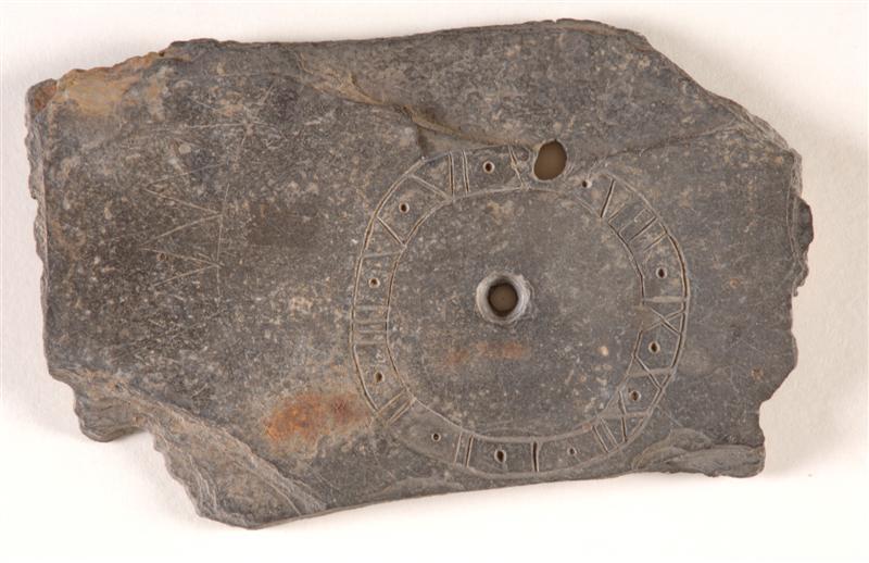 - BeschrijvingOnregelmatig, rechthoekig stuk lei, met onregelmatig ingekraste cirkelband met kloksgewijs romeinse cijfers I t/m X en XII. In het midden een gat. Op de cirkelband een 2e gat (beschadiging). Op 5,5 cm uit het centrum fragment van dun ingekraste cirkelband met zigzagdecoratie.