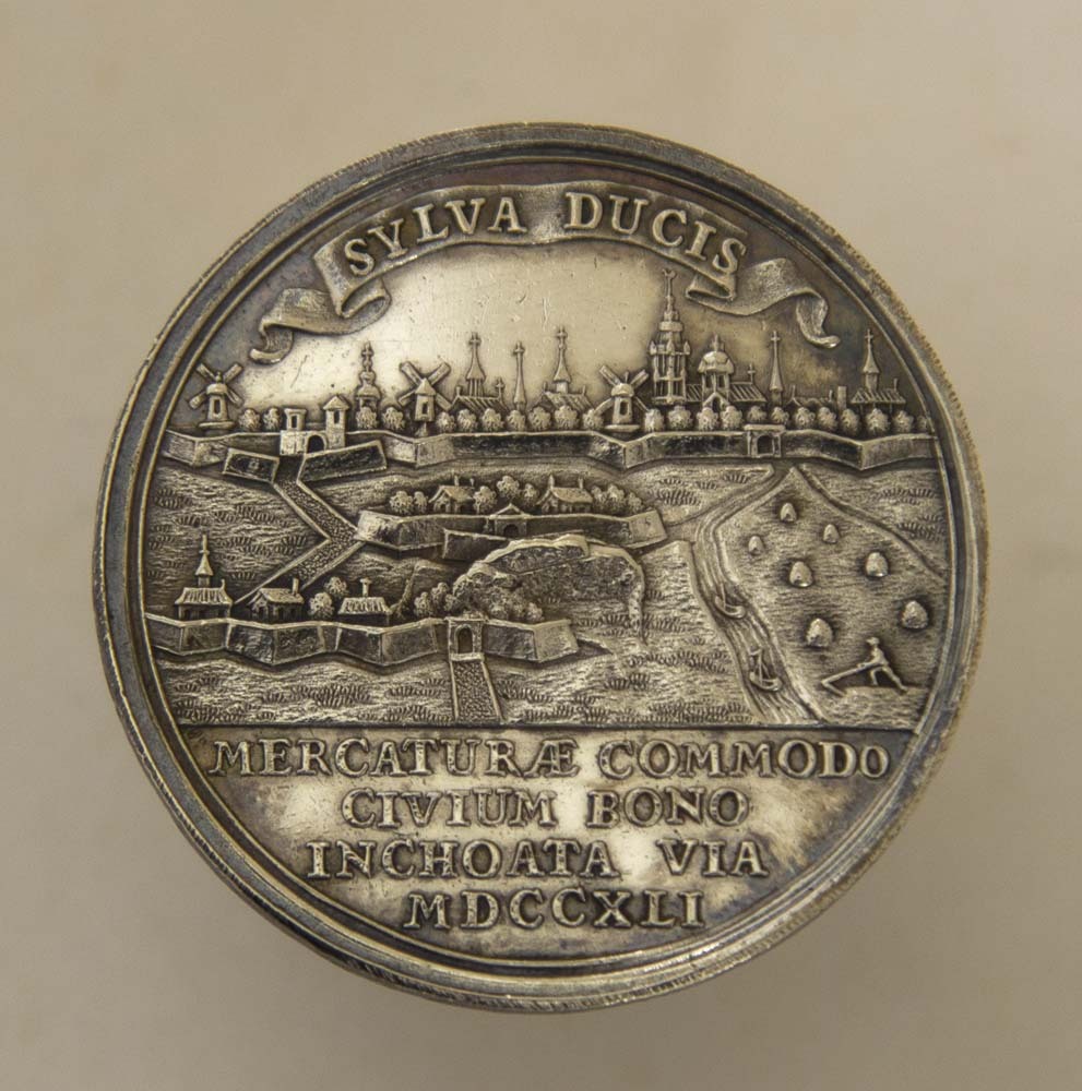 Penning op de aanleg van de steenweg van 's-Hertogenbosch naar Eindhoven. Voorzijde: Gezicht op de stad uit het zuiden. Op de voorgrond de straatweg langs de schans St.Anthonie en door het fort Isabella. Rechts twee scheepjes, zeven hooibergen en een maaier. Midden boven op een banderol: SYLVA DUCIS Op de afsnede: MERCATURAE COMMODO/CIVIUM BONO/INCHOATA VIA/MDCCXLI ("De weg begonnen ten gerieve van de koophandel, ten beste der burgers"). Keerzijde: Mercurius, vliegend, zijn staf in de linkerhand en wijst met de rechter op een hoorn des overvloeds en enige handelsgoederen. Rechts zit de stedemaagd met het stadswapen. Opschrift: PER FICERE URGET. ("Hij drijft haar aan om het te volbrengen"). Op de afsnede S*C