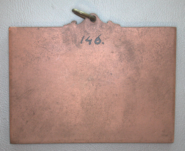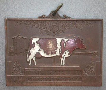 Rechthoekige plaquette met een versierd oog aan de bovenzijde. Voorzijde: Een roodbonte (geƫmailleerde) koe, staande op een sokkel. Achter de koe een boom met daarin het stadswapen van 's-Hertogenbosch. Op de achtergrond de Brabanthallen. Op de sokkel staat: TENTOONSTELLING/'s-HERTOGENBOSCH ter weerszijden van de sokkel takken. Het geheel binnen een verdikte rand. Links onder gegraveerd: 1938/1e PR Keerzijde onbewerkt.