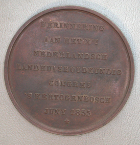 Voorzijde: Het gekroonde stadswapen van 's-Hertogenbosch. Achter het wapen links een kist met een globe, een kaart, een zeis, dorsvlegel, ploeg, palet en boeken. Rechts een baal, een rad, een zeilschip, een mercuriusstaf en op de voorgrond gereedschap. Onder een afsnede met: WURDEN F. BRUSSEL Keerzijde: Opschrift: HERINNERING/AAN HET X DE/NEDERLANDSCH/LANDHUISHOUDKUNDIG/CONGRES/'S HERTOGENBOSCH/JUNY 1855/vijfpuntige ster.