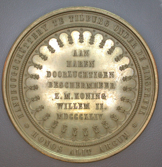 Voorzijde: Een naakte gelauwerde man, staand voor een monumentale zetel met een gekroonde W, legt een krans om het hoofd van een eveneens naakte man met een pijlenkoker op de rug. Links de kerk van 't Heike te Tilburg. Op de afsnede: het wapen van Tilburg, tussen twee guirlandes, waarboven: HART FECIT Keerzijde: Omschrift: HANDBOOG SCHUTTERY TE TILBURG ONDER DE ZINSPREUK/HONOS ALIT ARCUM. De zinspreuk staat tussen twee zesbladige bloemen. Binnen een kettingrand een verdiept middenvlak, dat omlijst wordt door een rand van boogjes. Op elk boogje een gekroonde W. Opschrift in het middenvlak: AAN/HAREN/DOORLUCHTIGEN/BESCHERMHEER/Z.M. KONING/WILLEM II./MDCCCXLIV.