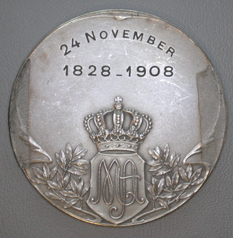 - BeschrijvingVoorzijde: De poort van het kasteel van Breda. Omschrift: KONINKLIJKE MILITAIRE ACADEMIE Keerzijde: Midden onder een gekroond schild met het monogram KMA ter weerszijden van het schild lauwertakken. Boven op een door een sierrand omgeven vlak gegraveerd: 24 NOVEMBER/1828-1908