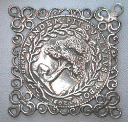 De penning is gevat in een opengewerkte ruitvormige zetting met rankenmotieven. Aan vz. monogram: G.V.B.F.