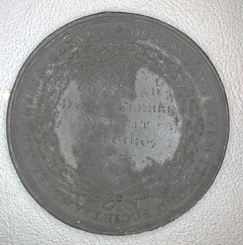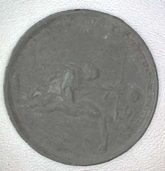 - BeschrijvingTinnen erepenning van Amsterdam aan C.D. Flekke uit Breda. Voorzijde: geknielde vrouw weert de dood van een stervende man. Randschrift: onleesbare Latijnse tekst. Keerzijde: Gegraveerd Coenraad Daniels Flekke Meruit Breda 1775. Randschrift: Observalum civem ex dono societ amstelaed cclvxll