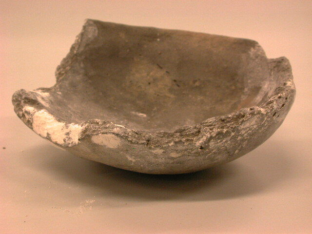 - BeschrijvingFragment van een geelgrauw kommetje. Rand ingesnoerd en naar buiten uitgebogen (bijpotje).