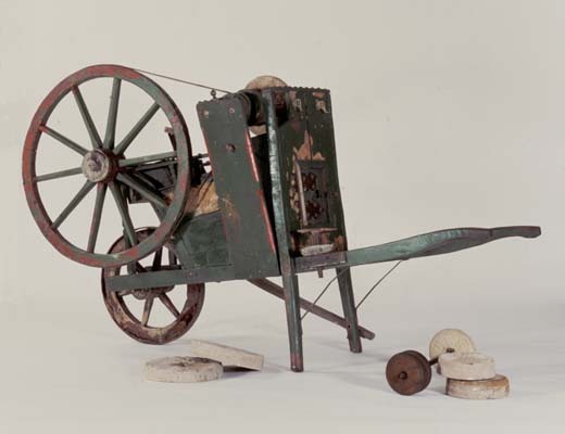 Model kruiwagen, waarop een scharenslijpersuitrusting is gemonteerd. Een groot wiel, aangedreven door een trapstang met leren riem. Via het grote wiel wordt d.m.v. een leren drijfriem een drijfas (verwisselbaar, 1.47 cm) met poelie en twee slijpstenen in beweging gebracht. Extra: een tweede drijfas met poelie en slijpsteen, alsmede vier losse slijpstenen.