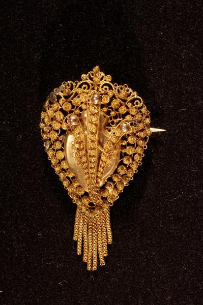 - BeschrijvingHartvormige gouden broche. In het midden een massief plaatje, omgeven met filigrainwerk. Op het plaatje 3 filigrainstrookjes, die elk eindigen in een massief half bolletje. Met speld-sluiting. Behorend bij inv.nrs. 10454.1 t/m 10454.4.