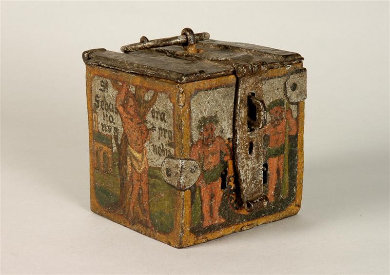 Van de Handboogschutterij, 's-Hertogenbosch. Linkerzijde: voorstelling van St. Sebastiaan en opschrift: "ST / Sebas / tia / nus / ora / pro / nobis". Voorzijde: wapen van de stad 's-Hertogenbosch met 2 wildemannen. Rechterzijde: voorstelling van St. Barbara en opschrift: "Sta / Bar= / bara" Achterzijde: opschrift: "Aº Di / 1534" en voorstelling van een kruis
