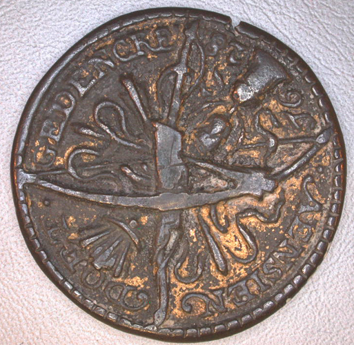 - BeschrijvingPenning van het St. Sebastiaansgilde te Middelburg. Vz: een gekroond wapenschild met een kruis, omgeven door bladmotieven. Kz: een tweetal handbogen, waarvan één aangelegd, en een pijlenkoker. Om het geheel een omschrift. Abusievelijk geïdentificeerd als Bossche penning.