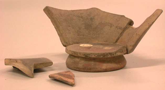 - BeschrijvingRoodbruin terra sigillata kommetje met secundaire brandsporen. Geheel in scherven, waarvan er vele ontbreken. Groef aan de binnenzijde onder de rand.