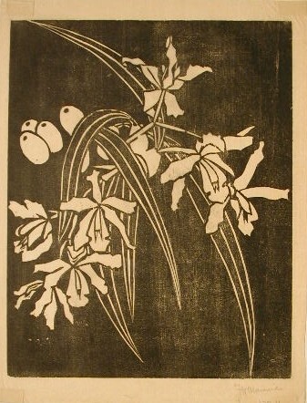 Tegen een zwarte achtergrond een tak met acht orchideeen.