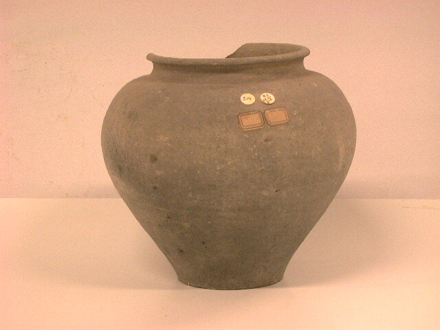 - BeschrijvingKookpot of urn. Ruwwandig met bolle schouder. Op de schouder zijn met een vinger 2 deukjes aangebracht. De rand is omgeslagen en afgeplat. De pot is vervaardigd van grijze klei, gesmoord.