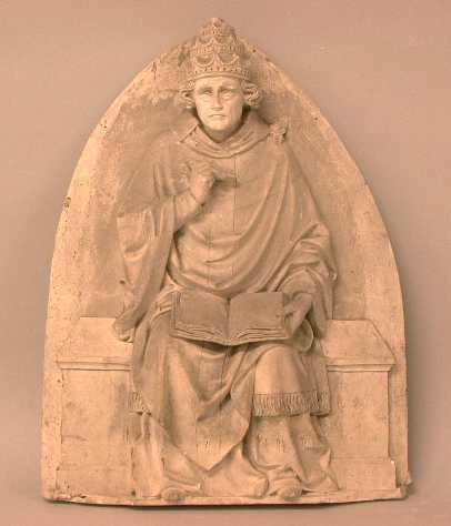 - BeschrijvingTegen een spitsboogvormige achtergrond is Gregorius de Grote als Paus voorgesteld, zittend met een opengeslagen boek op zijn schoot, een schrijfstift in de opgeheven rechterhand. Gregorius, een van de 4 kerkvaders, stierf op 11 maart 1604.