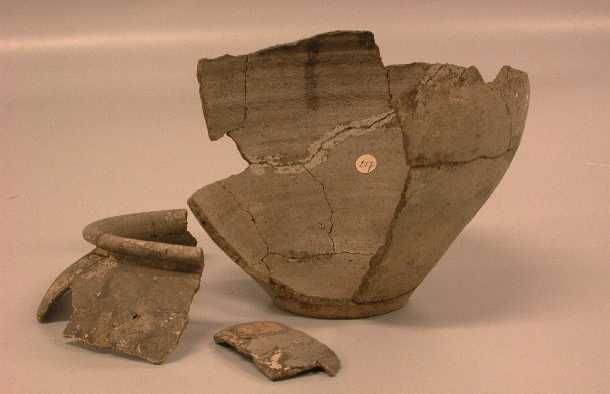 - BeschrijvingKookpot of urn. Ruwwandig, ovaal met ronde rand (teruggeslagen). In de smalle 'hals' zijn 2 groeven aangebracht. Vervaardigd van grauw-gele klei, gesmoord. De grootste omvang ligt ver boven het midden van de buik.