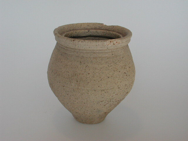 - BeschrijvingKookpot of urntje, langgerekt met zeer ingewikkeld randprofiel. Grootste omvang op het midden van de buik. Iets boven dat midden lopen twee groeven. De pot is vervaardigd van wit-gele klei en is ruwwandig. Binnenkant van de rand heeft een dekselgeul.