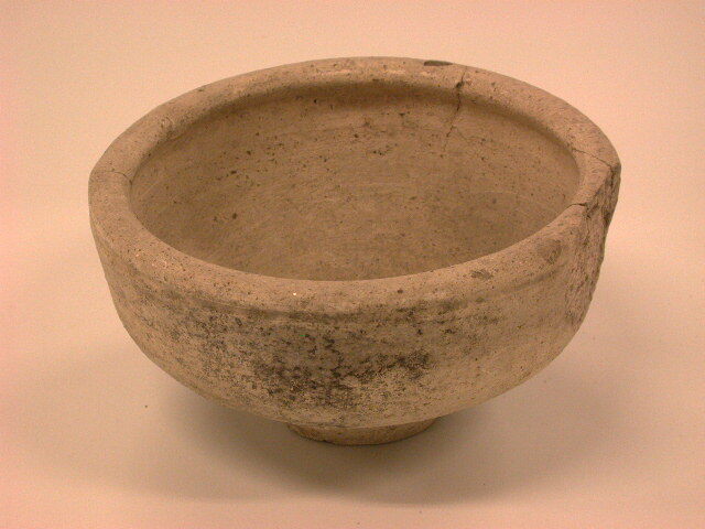 - BeschrijvingRuwwandige kom van wit-grijze klei, gesmoord of secundair verbrand. Kegelvormig. 2 groeven langs de rand, die iets verdikt is aan de binnenzijde