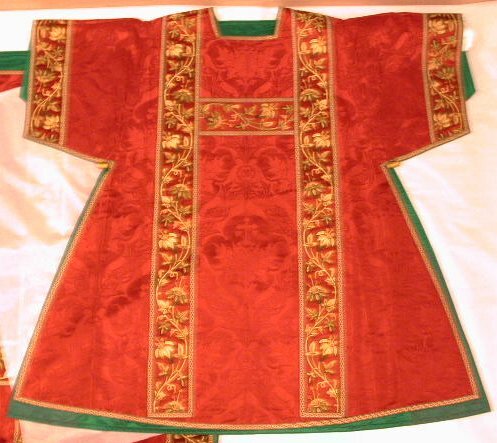 Dalmatiek/tuniek van rode zijden damast met granaatappelmotief, waarbij uit de appels kruizen rijzen. Op de voorkant zijn banden (= aurifrisiae) in H-vorm genaaid met handgeborduurde en geappliqueerde passiebloemranken in verschillende tinten oker en bruin. Langs de uiteinden van de mouwen is hetzelfde band gezet. De achterkant is identiek aan de voorkant, zij het iets langer. Aan de voorkant is aan de onderkant van de mouw links en rechts een geborduurde knoop genaaid. Op dezelfde plaatsen aan de achterkant zijn lussen bevestigd. De gehele dalmatiek (tuniek) is afgezet met galon met doornentakkenmotief en heeft een kunstzijden voering in 2 kleuren groen.